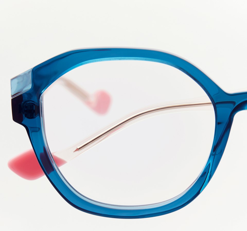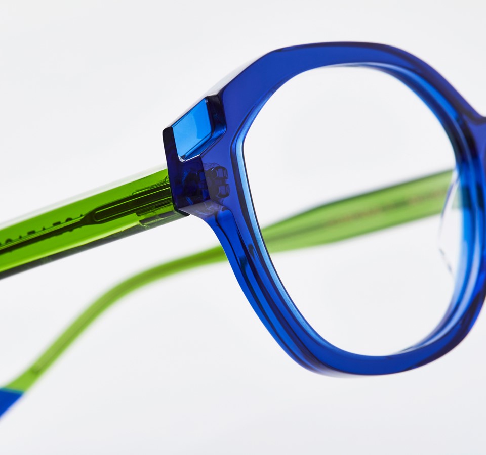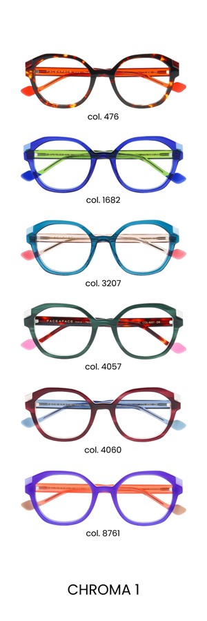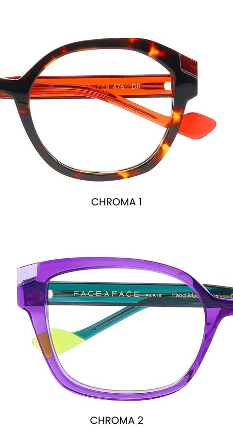 Graphically and chromatic, these glasses reveal their full colour potential through their sculpted curves. Playing with colour and transparency, checkered colours, bicolour detail on the temple, and a crossing of shapes crystallize at the hinge, contrasting a thick front with a very thin temple. CHROMA embodies the fundamental concept of colour in its simplest form. Sophisticated and colourful!