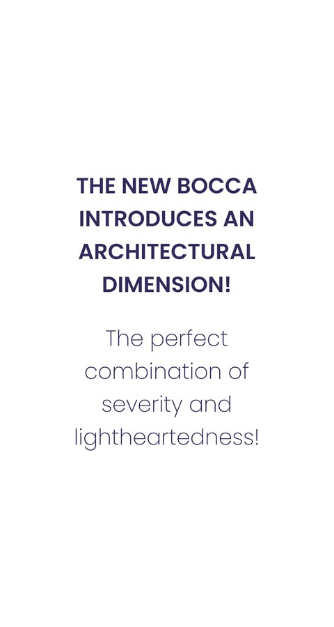 The new BOCCA introduces an architectural dimension! Its construction appears balanced due to a transverse colour bar, a graphic element that is at the heart of the design. Full of vibrancy and sparkle, the sculpted frame front reveals a very feminine high arch, punctuated by small coloured boots. The perfect combination of severity and lightheartedness!