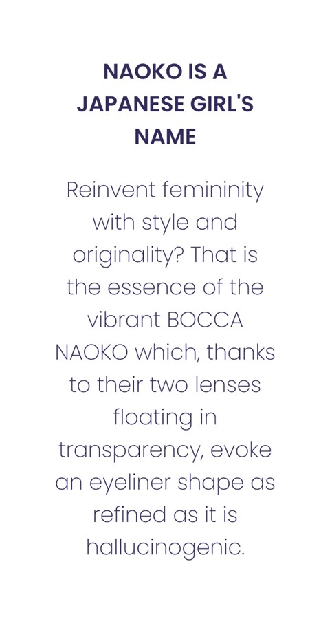 Reinvent femininity with style and originality? That is the essence of the vibrant BOCCA NAOKO which, thanks to their two lenses floating in transparency, evoke an eyeliner shape as refined as it is hallucinogenic. The highlight: the iconic BOCCA boot is reinvented here in a new shape and an origami of colours... Deliciously contemporary and playful!