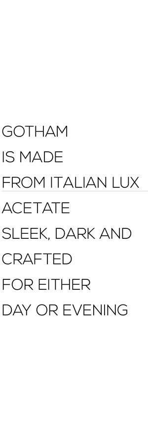 Chiseled and suave, like the Dark Knight himself, the masculine GOTHAM frames appear limits of the removal of material on their superior arcade. Both discreet and unmissable, its refined, neo-retro aesthetics is finished with bold, resolute end-pieces.