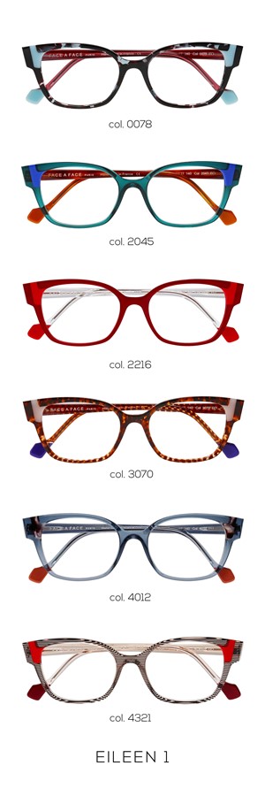 A flat rectangle and a large cat panto with sloping pins thus appear to be angled upwards: geometric and resolutely modern! The palette tends to mineral – glacial blue inserted into blue-grey tortoiseshell is echoed at the tips of the arms; it tends to graphic – a blue flash – midnight blue monochrome is warmed by tortoiseshell arms, punctuated by a saffron tip. Radiant and innovative!