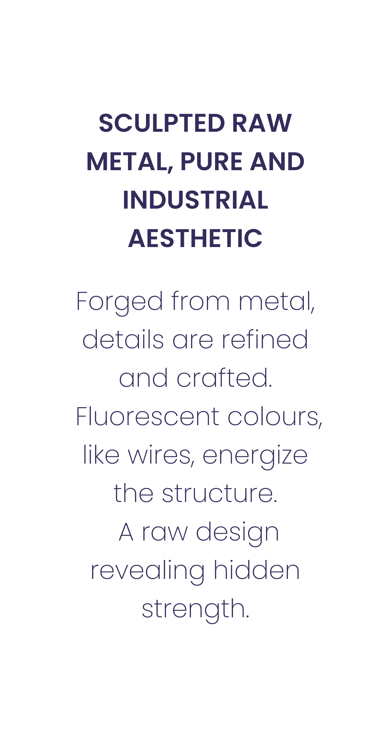 Scroll Factory FACTORY. Raw metal, vibrant energy.Forged from metal, details are refined and crafted.Fluorescent colours, like wires, energize the structure.A raw design revealing hidden strength.