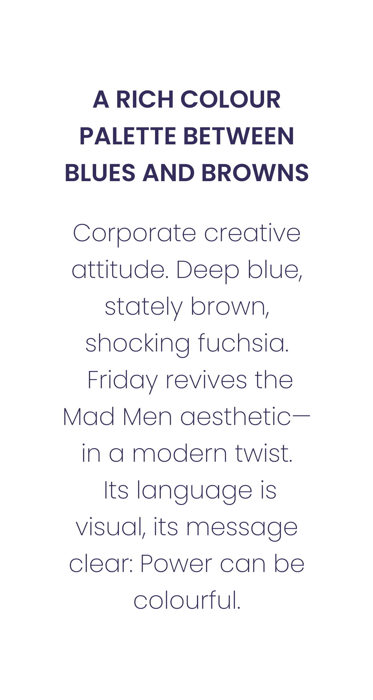 Scroll Friday Corporate creative attitudeDeep blue, stately brown, shocking fuchsia.Friday revives the Mad Men aesthetic—in a modern twist.Its language is visual, its message clear:Power can be colourful.