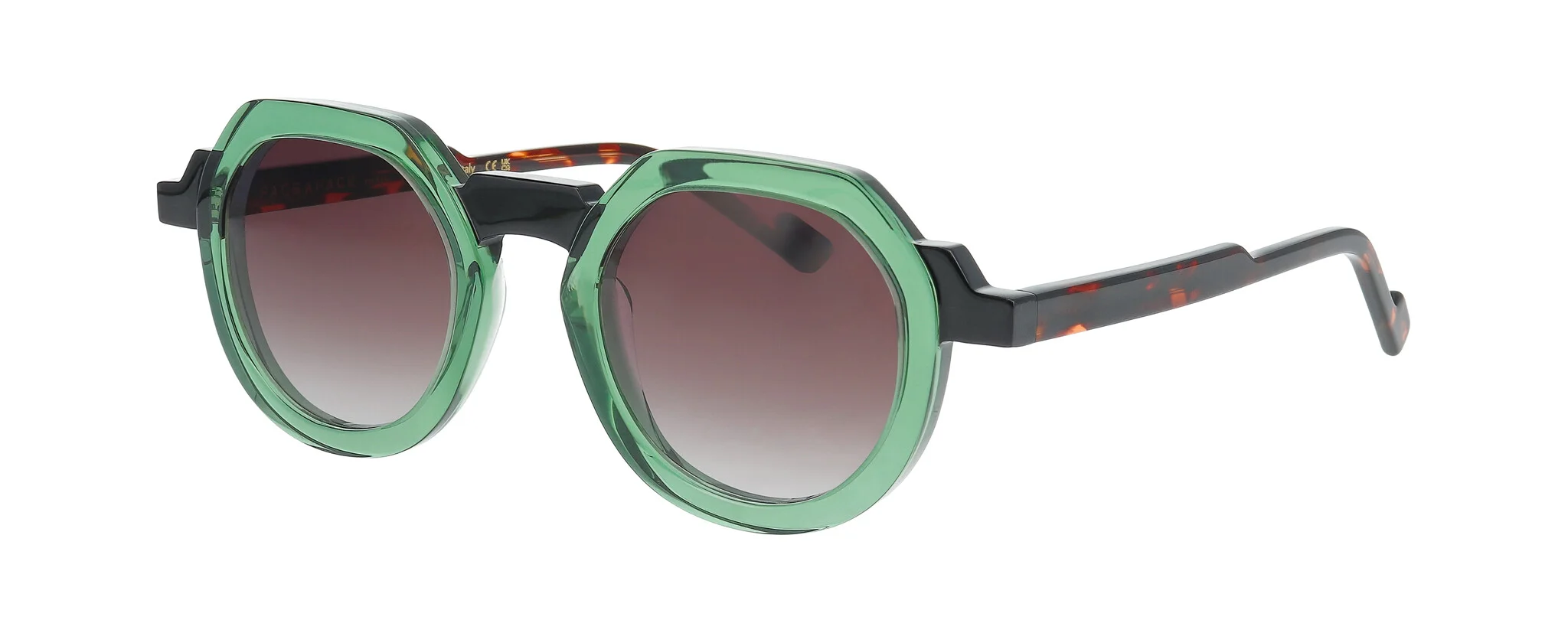 Separated-eye aesthetic with graphic motifs on bridge and endpieces.