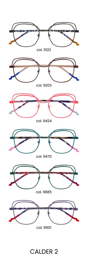 Suspendez-vous sans plus attendre au dessin aérien et graphique des CALDER ! Ces optiques ciselées semblent avoir été dessinées d’un seul geste, comme une spirale dans l’espace… Elles dévoilent des courbes aux effets sculpturaux qui varient subtilement de la face aux branches. Dynamisme ? Oui. Raffinement ? Aussi. Étonnement ? Toujours.