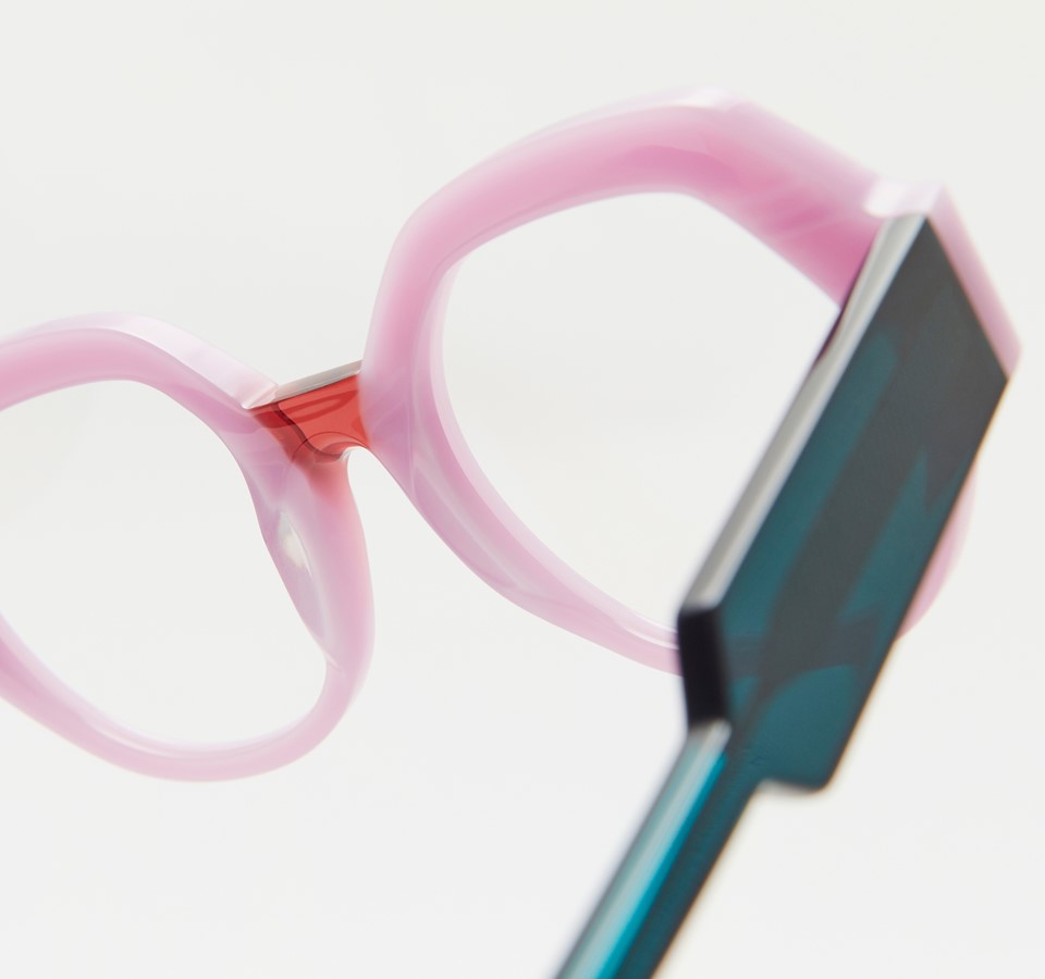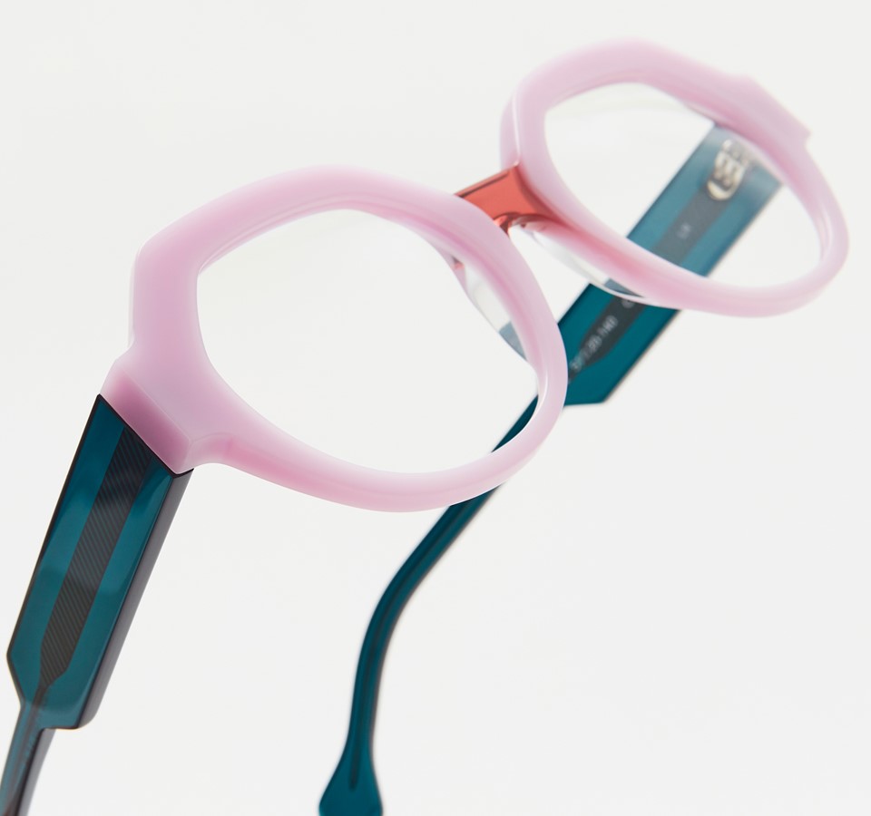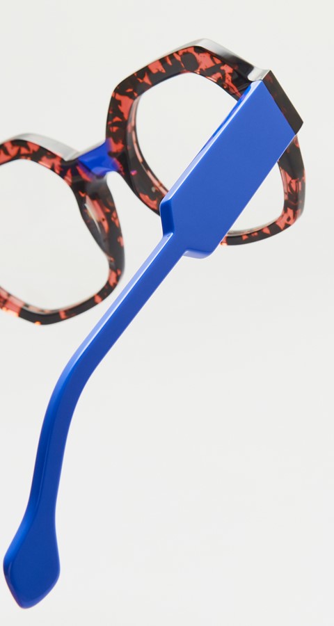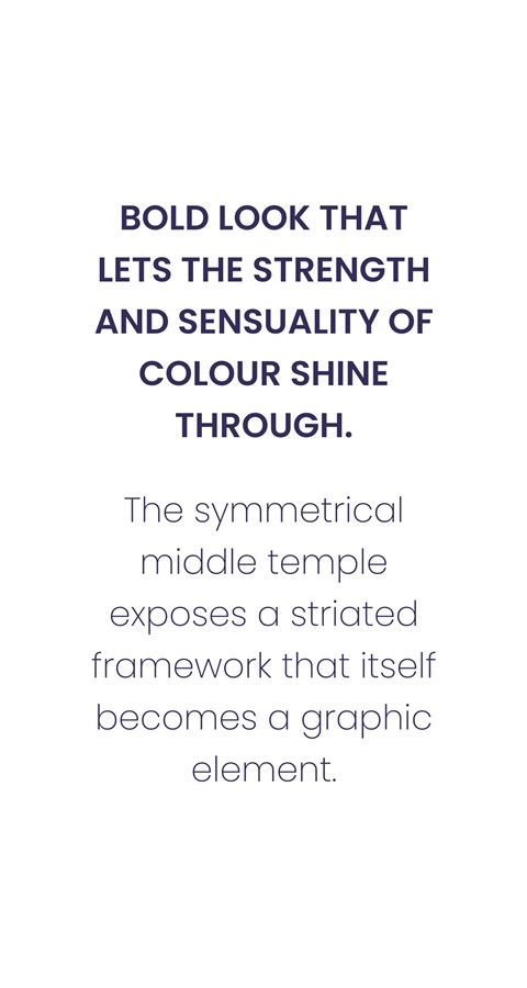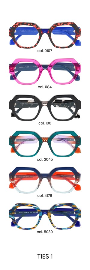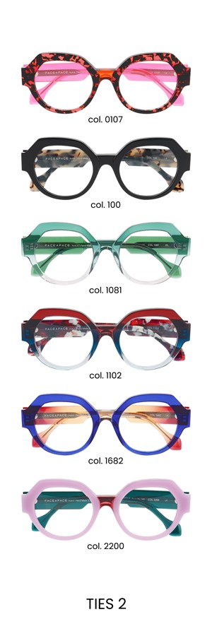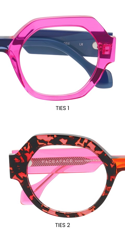 Les TIES s’affirment dans leurs épaisseurs et leur expression : l’énergie de deux formes en expansion graphique reliées par le nez qui fait le lien. L’esthétique industrielle et la générosité des volumes révèlent la profondeur des matières. La branche médiane symétrique laisse apparaître une armature striée qui devient un élément graphique à son tour. Un look assumé qui laisse parler la force et la sensualité des couleurs.