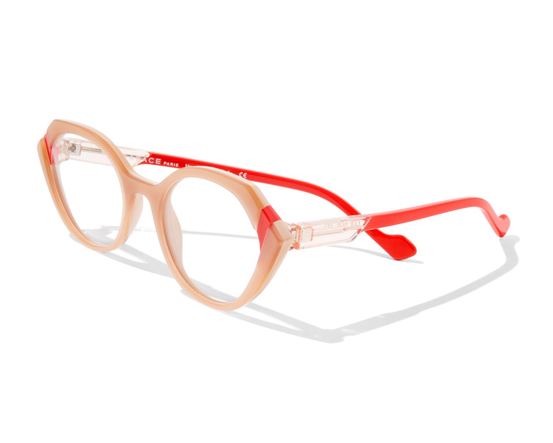 Un jeu entre le volume et le relief, entre le fin et l’épais donne du corps à la monture et à la branche : deux couleurs entrent en collision et se répondent de manière vibrante, pour des lunettes aussi vives que rythmées !