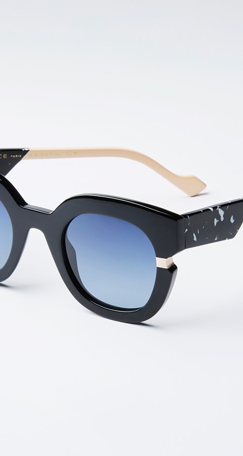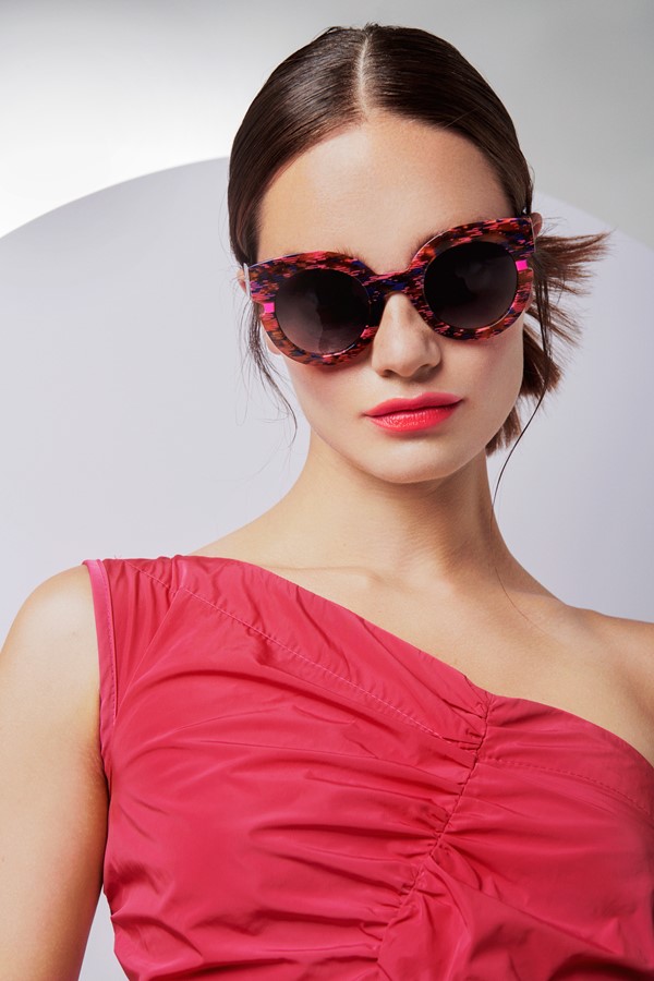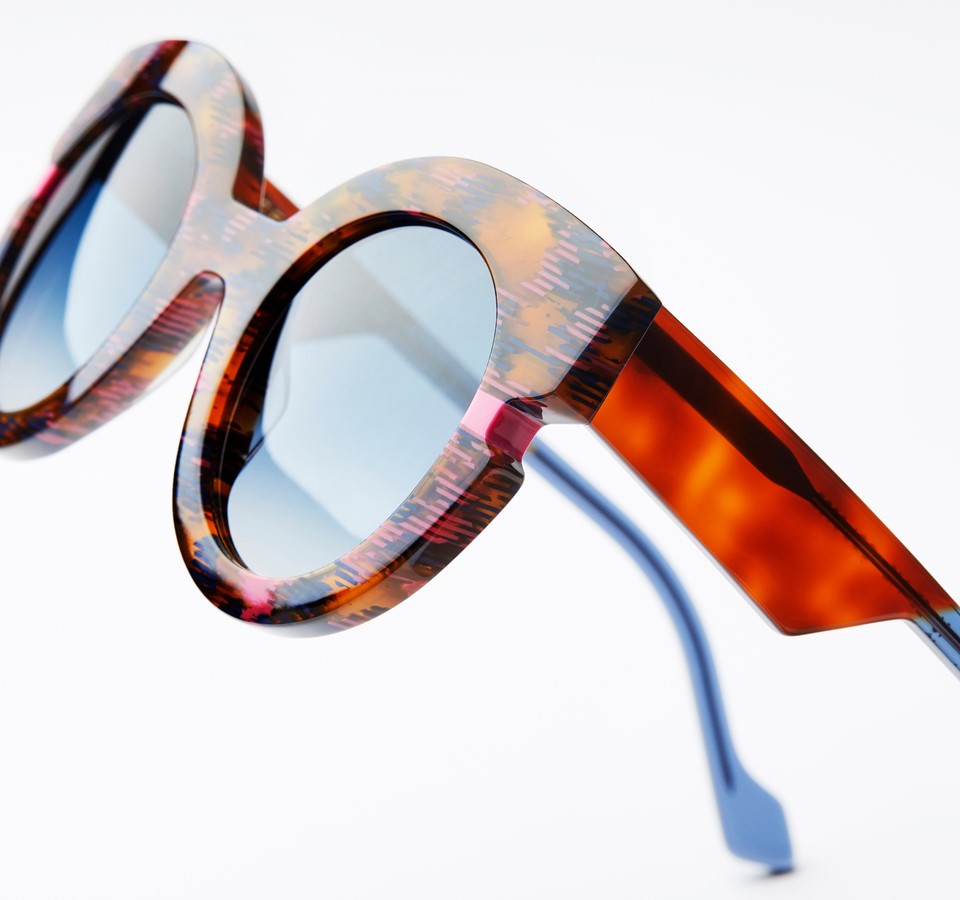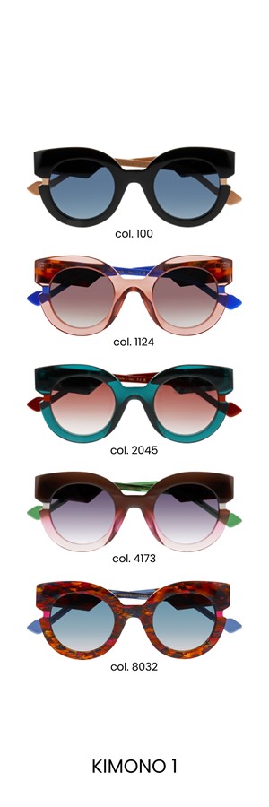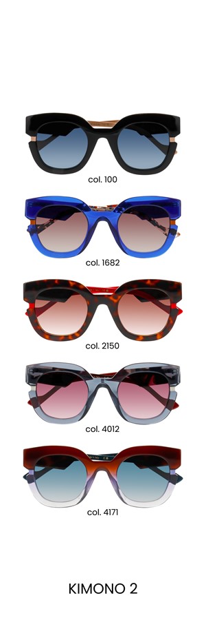 Cette solaire pleine d’esprit multiplie les clins d’œil à ce mythique vêtement nippon. L’amplitude exagérée de la branche évoque ainsi la très grande largeur des manches du kimono, le mijonc de la face souligne l’ampleur du drapé textile, tandis qu’enfin l’iconique petit carré de couleur vient comme cintrer le tout, et se prolonge par une branche fine telle une ceinture de soie. Des lunettes sophistiquées pour détonner et étonner !