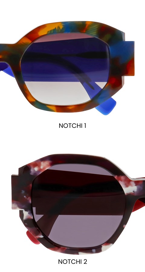 NOTCHI signifie « encoche » en japonais : une encoche est ainsi taillée entre face et branche, dans ces lunettes-bandeau larges et couvrantes, à la manière d’un interstice par lequel on tente d’apercevoir le regard.